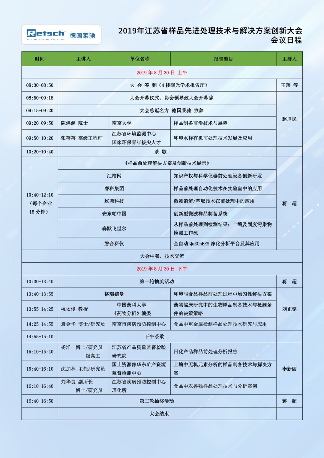 大會內(nèi)容:“2019年江蘇省樣品先進處理技術與解決方案創(chuàng)新大會”主要由最新樣品前處理技術前沿、最新樣品前處理設備研究進展、實驗室前處理技術、實驗室管理等一系列創(chuàng)新性專項主題組成,包括土壤、水、氣體、食品、質(zhì)檢等領域的前處理實際難題分析與討論。邀請國內(nèi)外前處理專家學者,檢測實驗室,高校院所等技術負責人共同參與研討。
